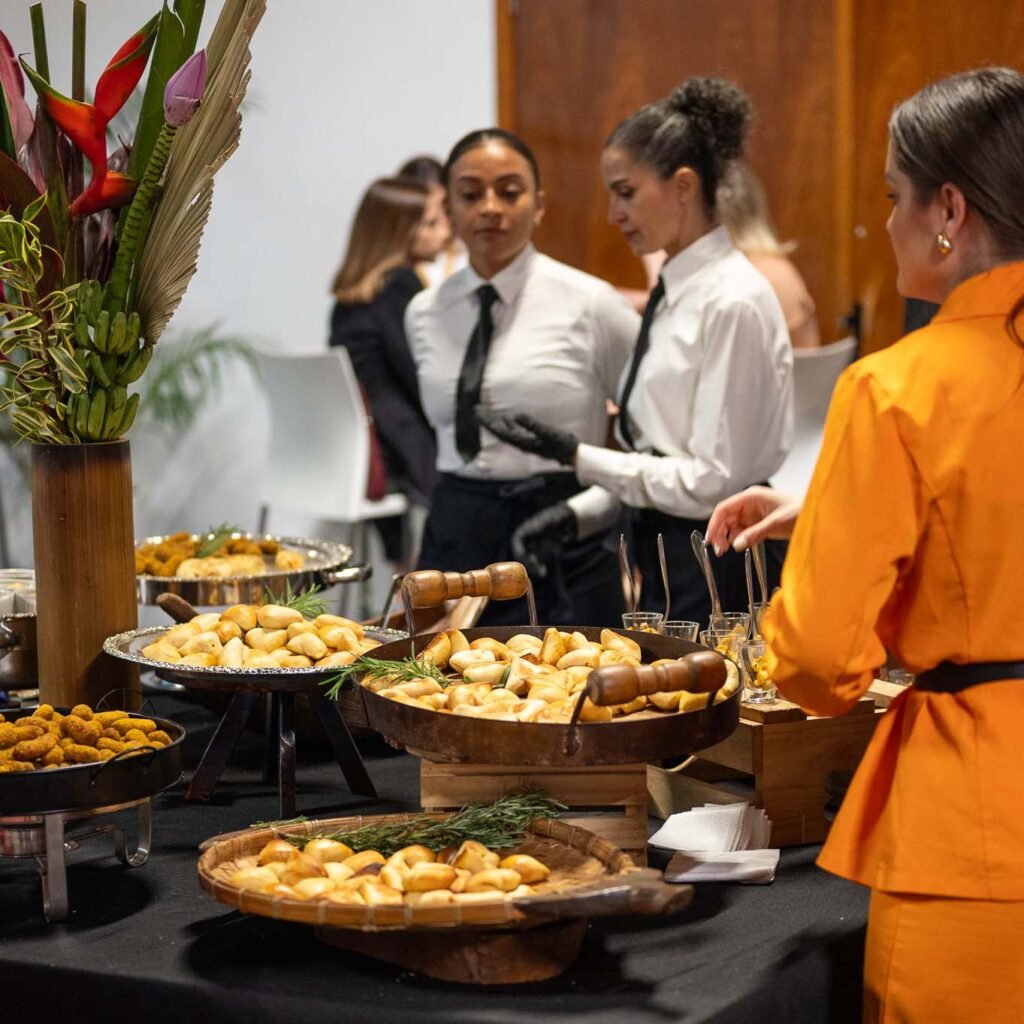 Desfrute de um evento impecável, onde seus convidados serão surpreendidos com comida deliciosa e uma apresentação elegante.